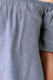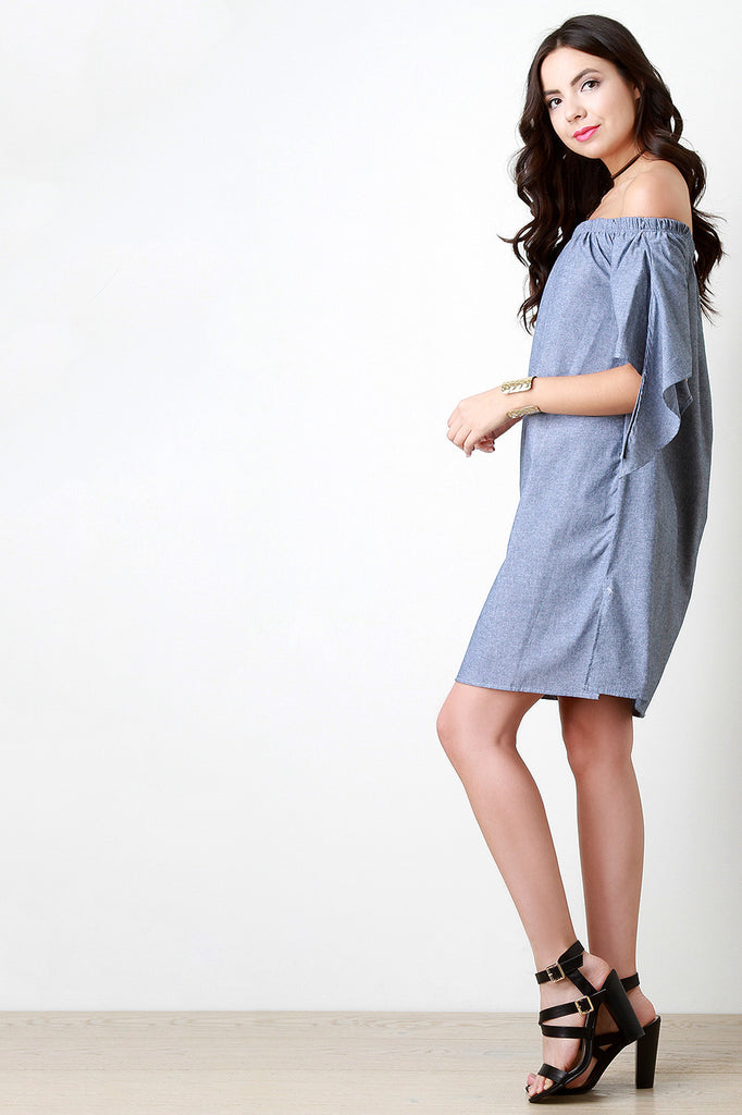 This trendy midi dress features a chambray fabrication, elasticized off the shoulder neckline, slit-detailed asymmetrical sleeves, and side slits. Accessories sold separately. Made in U.S.A. 100% Cotton.