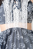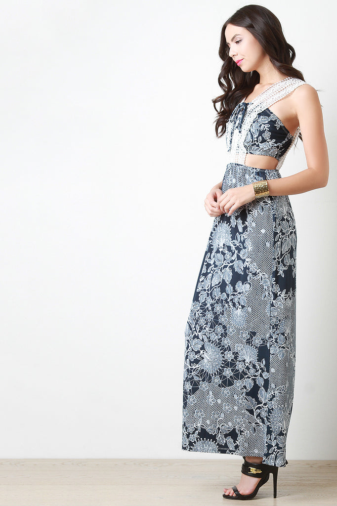 This sleeveless maxi dress features crochet lace upper half, side cutout, elasticized waist, and contrasting floral design throughout. Accessories sold separately. 96% Polyester, 4% Spandex.