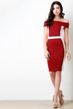 This alluring midi dress features a curve-enhancing colorblock design, wide banded off the shoulder neckline, and rear zip-up closure. Accessories sold separately. Made in U.S.A. 65.5% Rayon, 30.5% Nylon, 4% Ponti.