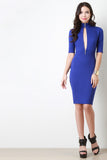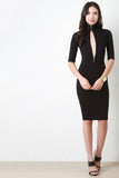 This dress features a mock neckline, quarter-length sleeves, wide cinched waist panel, keyhole slit front with zipper accent at ends, sculpture fit, and a zipper back. Accessories sold separately. Made in U.S.A. 62% Viscose, 33% Nylon, 5% Spandex.