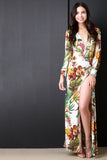 This stylish dress features a lightweight stretchy knit fabric, tropical printed deisgn, surplice v-neckline, cuffed longsleeves, and high vent slit with tab detail. Finished with a maxi-length hemline. Accessories sold separately. Made in U.S.A. 95% Polyester, 5% Spandex.