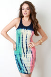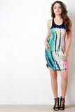 This casual dress features a jersey knit fabric, contrasting tie-dye print design, scoop neckline, and sleeveless fit. Finished with a mini-length rounded hemline. Accessories sold separately. Made in U.S.A. 95% Rayon, 5% Spandex.