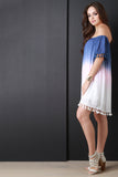 This midi dress features dip dye fabric, elasticized off the shoulder neckline, short sleeves, tassel accents, and finished with lining. Shell: 100% Rayon. Lining: 100% Polyester.