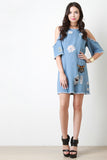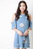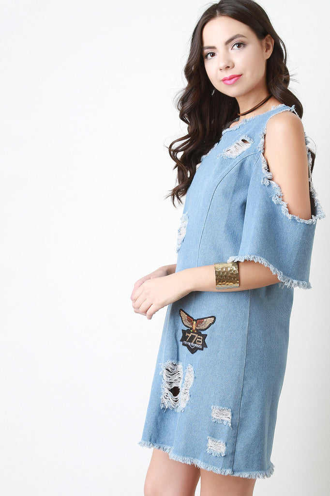 This shift dress features distressed denim, assorted patches, round neckline, open shoulders, short sleeves, and back zipper closure. Accessories sold separately. 65% Cotton, 35% Polyester.