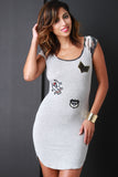 This jersey knit dress features a round neckline, camouflage short raglan sleeves, round hemline, and military inspired patch at front. Made in U.S.A. 95% Rayon, 5% Spandex. Contrast: 69% Polyester, 27% Rayon, 4% Spandex.