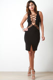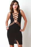 This bodycon dress features a cutout front with crisscross cage design, sleeveless, sculpture silhouette fit, and a vent slit front. Accessory sold separately. Made in U.S.A. 96% Polyester, 4% Spandex.