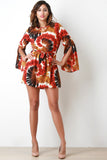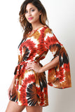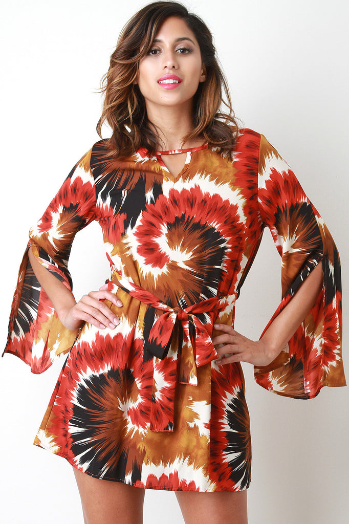 This mini dress features a round neckline with a v-keyhole cutout yoke, long bell sleeves, self-tie sash, and brushstroke tie-dye pattern print. Accessory sold separately. Made in U.S.A. 100% Polyester.