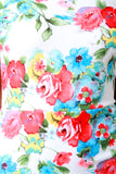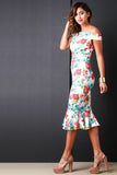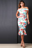 This trendy dress features a smooth stretchy knit, watercolor floral print pattern, off the shoulder neckline, and mermaid cut with ruffled midi-length hemline. Finished with an exposed rear zip-up fastener. Accessories sold separately. Made in U.S.A. 65.5% Rayon, 30.5% Nylon, 4% Ponti.