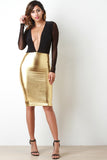 This twofer bodycon dress features a deep v-neckline, semi-sheer mesh long sleeves, high waisted cinched seam, contrasting metallic midi skirt, and a vent slit at back hem. Accessory sold separately. Made in U.S.A. 96% Polyester, 4% Spandex.