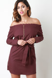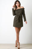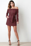 This gorgeous mini dress features a smocked off-the-shoulder neckline, cuffed long sleeves, and self-tie sash closure at waist. Accessories sold separately. 100% Cotton.