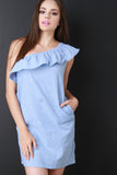 This mini dress is shift dress silhouette, featuring a one shoulder design with a ruffle accent. Chambray knit fabrication with mixed vertical stripes print. Two functional side pockets. Unlined. 100% Cotton.