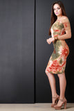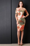 This bodycon dress features a jersey knit fabric with a rustic tie-dye print, off the shoulder elasticized neckline, short sleeves fit, and midi-length hemline. Accessories sold separately. Made in U.S.A. 95% Rayon, 5% Spandex.