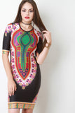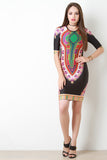 This bodycon dress features smooth stretch fabric, tribal print, round neckline, short sleeves, and midi length. Accessories sold separately. Made in USA. 95% Polyester, 5% Spandex.