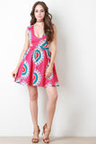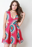 This skater dress features stretch fabric, mixed pattern print, deep scoop neckline, side cutouts, and a-line cut. Finished with tulle lining. Accessories sold separately. Made in USA. 95% Polyester, 5% Spandex.