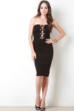 This midi dress features a sleeveless tube neckline, caged center with gold-tone buttons, princess seam, bodycon fit, and a vent slit at back hem. Accessory sold separately. 62% Viscose, 33% Nylon, 5% Spandex.