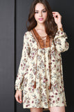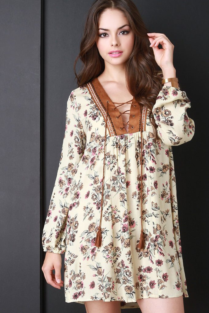 This shift dress features a v-neckline with vegan suede trimming, corset lace-up accent, long sleeves, and floral print on texture knit fabrication. Accessory sold separately. 100% Rayon. Contrast: 100% Polyester.