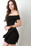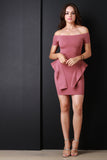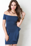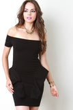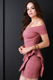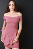 This off the shoulder dress features an elastic neckline, short sleeves, thick knit fabrication, bodycon silhouette, ruffle detail on hip and a mini length hemline. Accessories sold separately. Made in U.S.A. 65% Rayon, 30% Nylon, 5% Spandex.