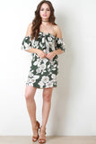 This bardot dress features an elasticized off the shoulder neckline, short sleeves, flutter tier with a self-tie center bow, shift cut, and hibiscus floral print. Accessory sold separately. 100% Rayon.