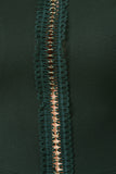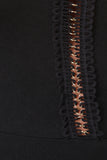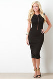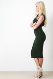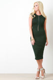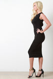This midi dress features a round neckline, sleeveless design, center vertical slits trim with lace and ringlets, keyhole back, and cinched waist seam. Accessories sold separately. Made in U.S.A. 95% Polyester, 5% Spandex.