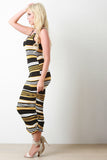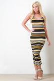 This sleeveless midi dress features a scoop neckline, horizontal stripes on ribbed knit fabrication, elasticized ruched sides, and sculpture fit. Accessories sold separately. Made in U.S.A. 60% Polyester, 35% Rayon, 5% Spandex.