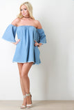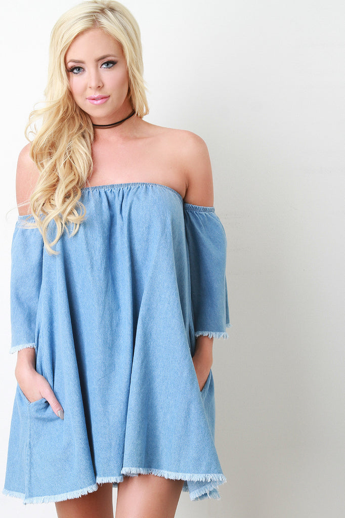 This bardot style shift dress features denim fabric, elasticized off the shoulder neckline, long sleeves, hidden pockets, and frayed raw edges. Accessories sold separately. Made in USA. 100% Cotton.