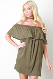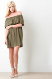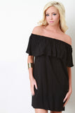 This relaxing shift dress features a woven fabric, elasticized off the shoulder neckline, ruffle detailed, and mini-length hemline. Accessories sold separately. Made in U.S.A. 100% Polyester.