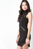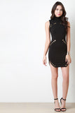 This bodycon dress features stretch fabric, mock neck, sleeveless construction, grommet accents, and side slits. Accessories sold separately. Self: 97% Polyester, 3% Spandex.