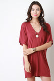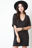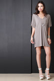 This casual dress features a jersey knit fabric, deep v-neckline, dolman sleeves construction, and mini-length hemline. Finished with a relaxing fit. Accessories sold separately. Made in U.S.A. 75% Modal, 25% Polyester.