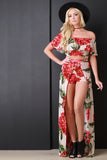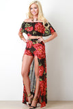 This beautiful matching set features floral print on semi sheer mesh fabrication, bardot top with an elasticized off the shoulder neckline, flutter tier, and crop hemline. Bottom half features a high waisted elasticized band, shorts underlay, and maxi open front overlay. Accessories sold separately. Made in U.S.A. 90% Nylon, 10% Spandex.