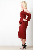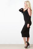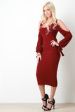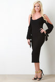 This bodycon dress features a cold shoulder design with thin shoulder straps, self-tie cuffed longslees, and midi-length hemline. Accessories sold separately. Made in U.S.A. 95% Polyester. 5% Spandex.