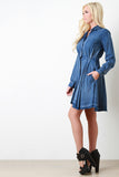 This midi dress features chambray denim, button up front, long sleeves, a-line cut, and frayed hem. Accessories sold separately. 70% Tencel, 30% Cotton.