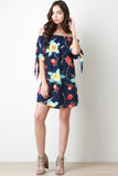 This pretty dress features a floral print throughout, elasticized off the shoulder neckline, elbow-length tie bell sleeves design, and shift cut fit. Partially lined. Accessories sold separately. 100% Polyester.