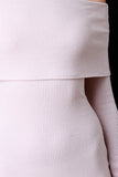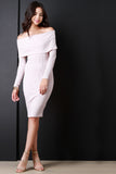 This cozy dress features a ribbed knit fabrication, wide band off the shoulder neckline, longsleeve construction, and midi-length hemline. Accessories sold separately. Made in U.S.A. 95% Rayon, 5% Spandex.