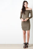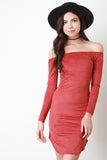 This casual dress features a vegan suede fabric, longsleeves construction, bardot neckline, and mini-length rounded hemline. Accessories sold separately. Made in U.S.A. 90% Polyester, 10% Spandex.