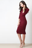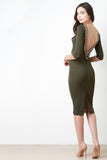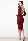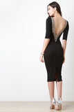 This sexy dress features stretch fabric, beaded cutout deep v-back, half-length sleeves, bottom back slit, and midi length. Accessories sold separately. Made in USA. 95% Polyester, 5% Spandex.