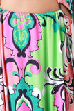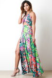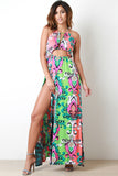 This maxi dress features drawstring halter neckline, cutout midsection, high vent m-slit design, and colorful damask pattern print. Accessories sold separately. Made in U.S.A. 95% Polyester, 5% Spandex.