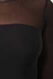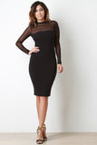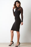 This bodycon dress features semi-sheer mesh bodice with solid knit fabrication, long sleeves design, stretchy sculpture fit, and concealed back zipper closure. Made in U.S.A. 95% Polyester, 5% Spandex.