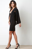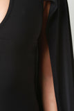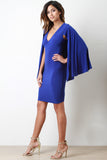 This elegant bodycon dress features a plunging v neckline, draping shawl-like cape sleeves, and stretchy bodycon fit. Accessories sold separately. Made in U.S.A. 95% Polyester, 5% Spandex.