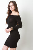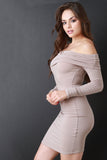 This bardot bodycon dress features soft rib knit, foldover off the shoulder neckline, and long sleeves. Accessories sold separately. Made in USA. 100% Polyester.