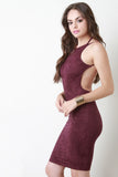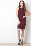 This bodycon dress features faux suede, round neckline, self-tie spaghetti straps, open back, and midi length. Accessories sold separately. Made in USA. 100% Rayon.