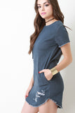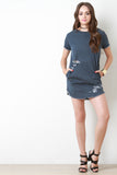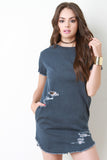 This denim dress features a round neckline, short sleeves, zipper back, hidden side pockets, round hemline, distress design, and frayed hemline. Accessory sold separately. Made in U.S.A. 100% Cotton.