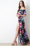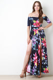 This maxi dress features a soft stretchy knit, floral print pattern, off the shoulder neckline, and elbow sleeves construction. Finished with two front high vent slits and boxer shorts underlay. Accessories sold separately. Made in U.S.A. 95% Polyester, 5% Spandex.