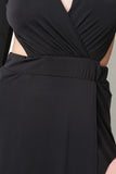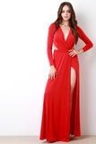 This stylish dress features silky stretchy knit, front cross wrap design, deep v-neckline, open back, and longsleeves construction. Finished with a wide elasticized waist, maxi-length hemline, and high slit. Accessories sold separately. Made in U.S.A. 95% Polyester, 5% Spandex.