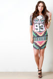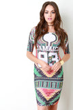 This bodycon dress features a smooth stretchy knit fabric, tribal print throughout, jamaica 93 graphic, boat neckline, and short sleeves. Finished with a mini-length hemline. Accessories sold separately. Made in U.S.A. 95% Polyester, 5% Spandex.
