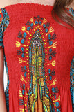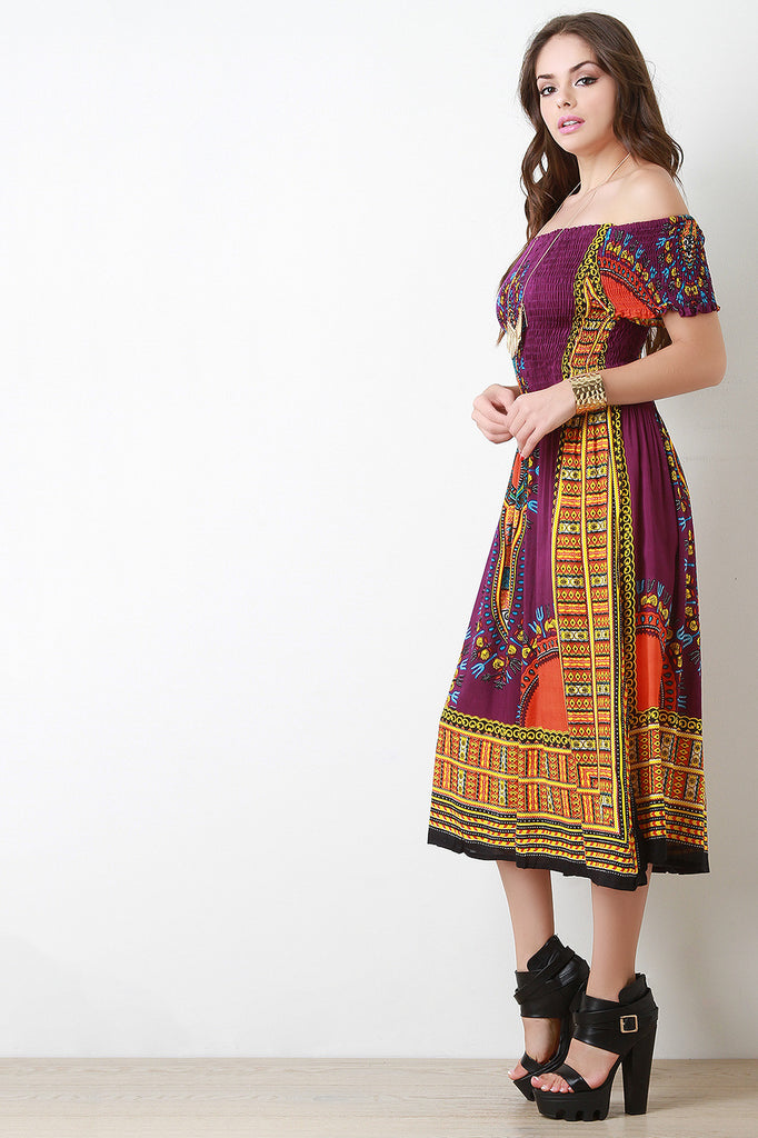 This midi dress features a woven fabric designed with dashiki print, smocked upper part, elasticized off the shoulder neckline, and short sleeves. Accessories sold separately. 100% Rayon.