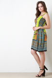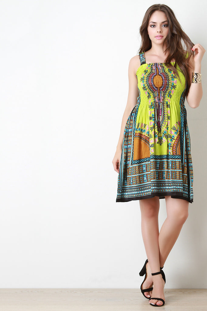 This festive dress features a woven fabric with dashiki print design, smocked upper construction, shoulder straps, and flare skirt. Finished with a midi-length hemline and self-tie waist sash. Accessories sold separately. 100% Rayon.