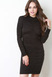 This stylish dress features a soft knit fabrication, mock neckline, long sleeves, and all-around ruched design. Finished with rear zip-up closure and mini-length hemline. Accessories sold separately. Made in U.S.A. 95% Polyester, 5% Spandex.