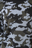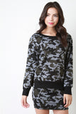 This sweater top features a round neckline, long sleeves, contrasting hems, camouflage design, and self-tie bows at open back. Accessory sold separately. 15% Cotton, 80% Polyester, 5% Spandex. Contrast: 100% Cotton.