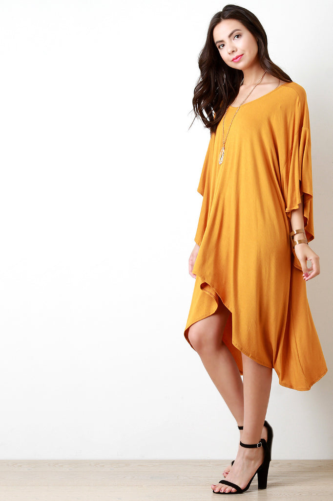 This casual dress features a jersey knit fabric, dropped shoulder seams, ruffle sleeves, and sharkbite hem. Finished with a round neck and v-back detail. Accessories sold separately. 96% Bamboo Viscose, 4% Spandex.