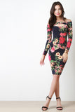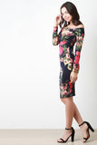 This elegant dress features smooth stretch fabric, floral print, off the shoulder neckline, cut out design, long sleeves, and midi length. Accessories sold separately. Made in USA. 95% Polyester, 5% Spandex.